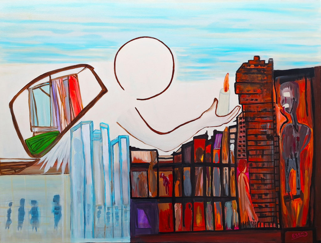 ESENJ met en scène un personnage angélique tendant la main vers un monde en souffrance. Portant sur son dos une structure chaotique. C’est une métaphore des vies oubliées et des êtres en détresse. La figure centrale incarne la compassion, la bonté et l’acte de soutien désintéressé. Une aile blanche surgit discrètement à la base de cette charge, symbolisant la lumière intérieure de celles et ceux qui se battent pour élever les autres. La main tendue offre une bougie : un geste simple mais porteur d’un message puissant : il y a de l’espoir. Face aux prisons invisibles, aux vies cloisonnées, l’artiste nous rappelle l’importance de l’entraide. Hope est un appel à la solidarité, à l’empathie et à l’humanité.