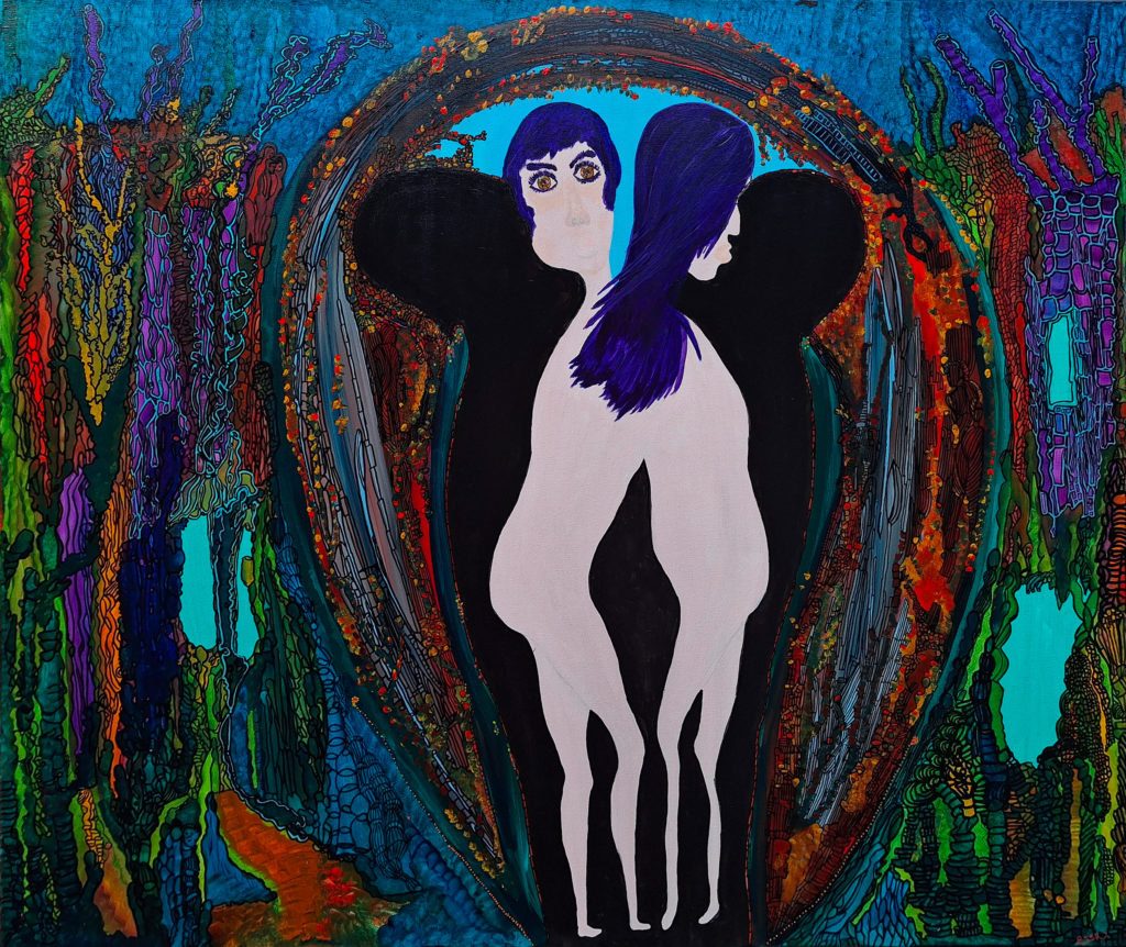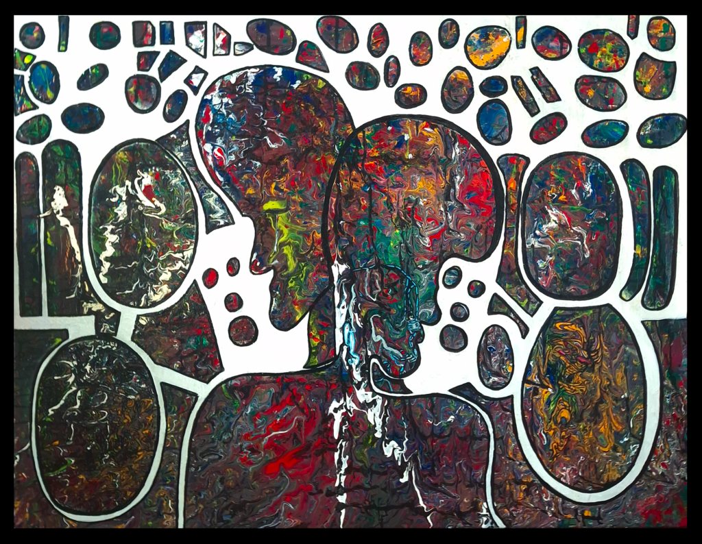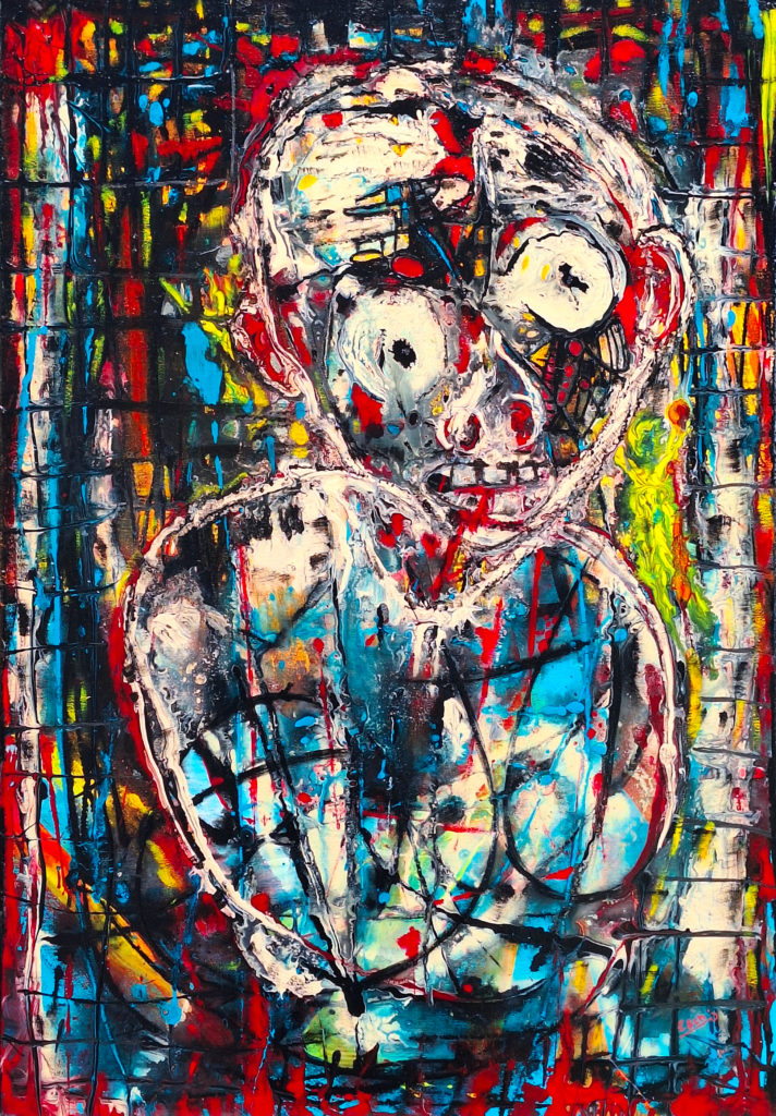Le tableau « Burn-out » représente une personne dépassée par ses émotions et par ceux qui l’entourent. Il subit une perte de contrôle sur ses émotions et il ressent une douleur psychique. Un mal-être très profond s’ancre en lui. Il rentre dans une dépression qu’il n’est pas sûr de pouvoir contrôler. Le burn out, la dépression, est un mal qui est malheureusement très fréquent. Vêtu d’une tenue de prisonnier, le personnage est étouffé par la souffrance de ses émotions et par les pensées qui le hantent. Le personnage ressent ses émotions de façon si intense et douloureuse qu’il se sent submergé, oppressé, voire incapable de les exprimer ou de les gérer. Cette souffrance émotionnelle peut provoquer un sentiment d’étouffement, comme si le poids des émotions l’empêchait de respirer ou d’avancer. Les têtes l’entourant représentent l’écho de ses propres pensées et le poids des mots des autres sur lui. Ne contrôlant plus rien, il souffre. Son regard est vide, il est comme une personne sans âme. Il est perdu et enfermé dans le vide ; il y a comme un voile dans ses yeux. Il est là sans être là. Prisonnier de ce monde de douleur, le monde qui l’entoure n’existe plus. C’est comme s’il était sous l’eau ; il y a un brouhaha constant mais il n’arrive plus à déchiffrer ou comprendre les autres ou ses propres émotions.