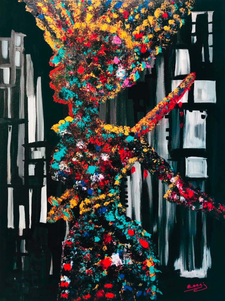 Des silhouettes sans visage et sans identité. Juste des contours, suspendus dans un tumulte de couleurs vives et sombres. Ici, l’humain n’a plus de corps — il est âme et énergie. Dans ce tourbillon incandescent, chaque figure semble flotter entre deux mondes. Certaines montent, d’autres s’effondrent. Aucune n’est entièrement lumière ou entièrement ombre. Toutes portent, en silence, le poids d’un destin. ESENJ ne peint pas des individus, mais l’humanité dans ce qu’elle a de plus nu : chacun cherche sa voie. C’est le cycle de la vie. Parfois on est en haut et parfois on est en bas et ce n’est pas forcément de notre choix. The Souls est une vision de nous-mêmes, dépossédés, traversant les épreuves de la vie.