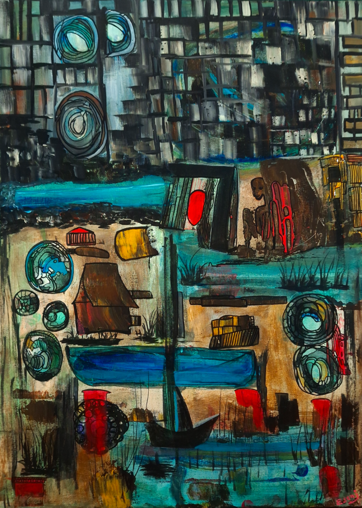Indifférence est une œuvre puissante qui explore, sans détour, la fracture entre richesse, confort et l’inaction face à la souffrance humaine. Divisée en trois scènes, la toile juxtapose les extrêmes : à gauche, une ville opulente et colorée symbolise la prospérité, masquant dans ses ombres une froide indifférence. À droite, la mort et l’enfermement sont incarnés par une silhouette rouge cachée derrière une faucheuse, enfermée derrière une grille noire. Au centre, une tornade blanche anthropomorphe s’élève de la mer agitée, représentant les âmes englouties, les naufragés oubliés. Des mains blanches émergent de l’eau, comme des appels silencieux à l’aide, soulignant la vulnérabilité et l’innocence des victimes. La figure d’un homme à la tête grise, aux yeux rouges et à la langue tirée incarne l’hostilité volontaire et le mépris. L’artiste y dénonce l’aveuglement délibéré, la fermeture de frontières, et l’égoïsme des sociétés qui choisissent l’indifférence malgré leur abondance. Par cette œuvre, ESENJ appelle à une prise de conscience, à raviver notre humanité et à refuser de détourner le regard. Indifférence nous interpelle : jusqu’à quand accepterons-nous d’être spectateurs passifs de la détresse des autres ?